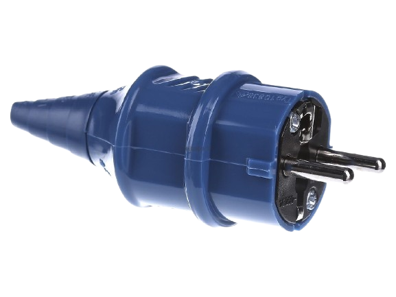 Designed for 16A / 250V applications, this plug is compatible with standard Schuko sockets and is widely used in workshops, construction sites, and industrial facilities. The blue color coding helps easily identify voltage levels and application types. Its ergonomic, easy-grip body allows quick connection and disconnection, making it ideal for frequent use in both fixed and mobile setups.