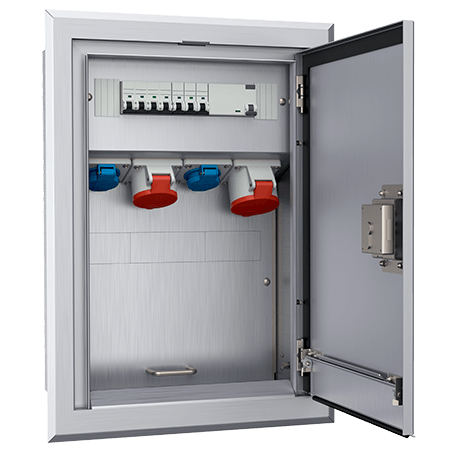 Flush-mounted receptacle combinations made of durable stainless steel, equipped with CEE and SCHUKO® sockets. All units provide IP43 ingress protection when the door is closed.